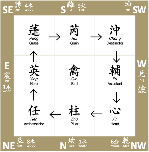 The 9 Stars always appear in same clockwise sequence. The Heavenly Grass > the Heavenly Grain > the Heavenly Destructor > the Heavenly Assistant > the Heavenly Heart > the Heavenly Pillar > and the Heavenly Ambassador > with the Heavenly Hero.