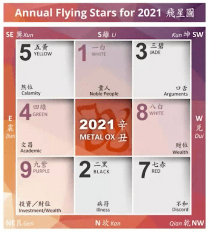 In General, Flying Star 2, 3, 5 & 7 is consider as an inauspicious stars. This year the Flying Star chart will take effect only after Feb 3, 2021.